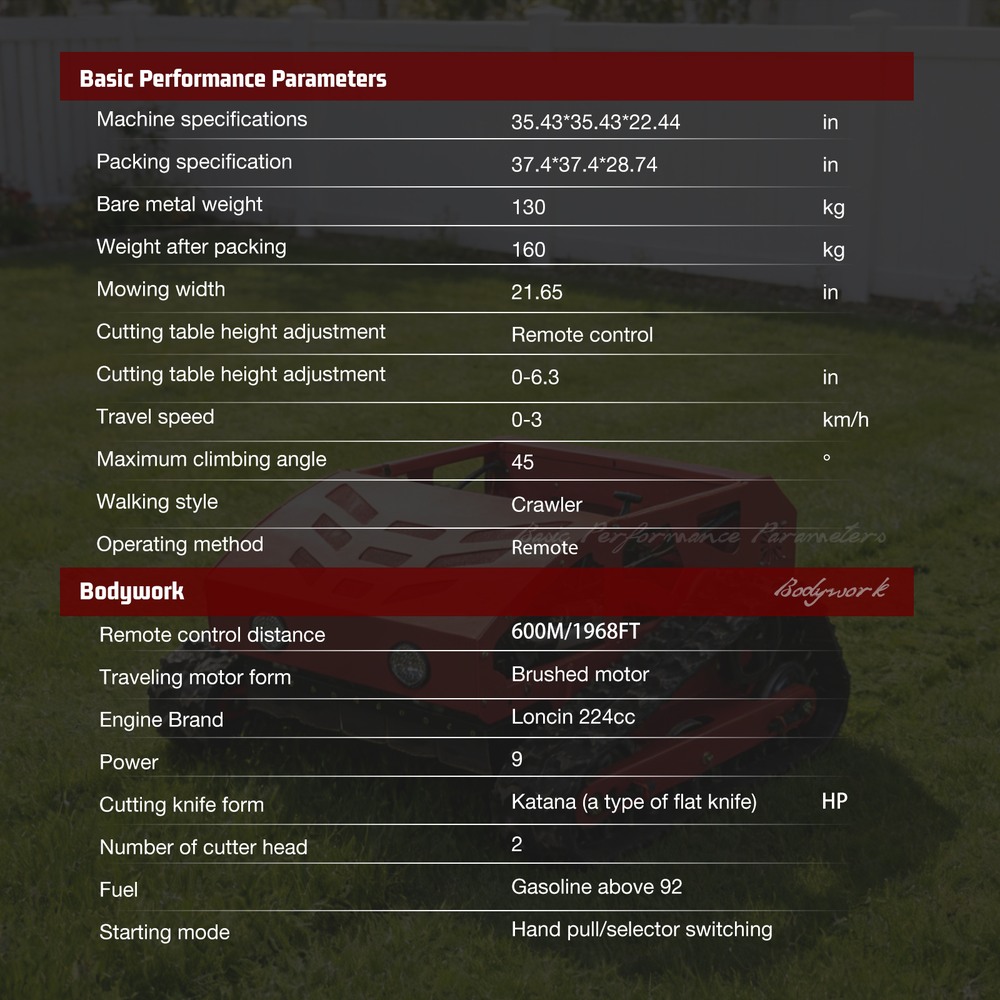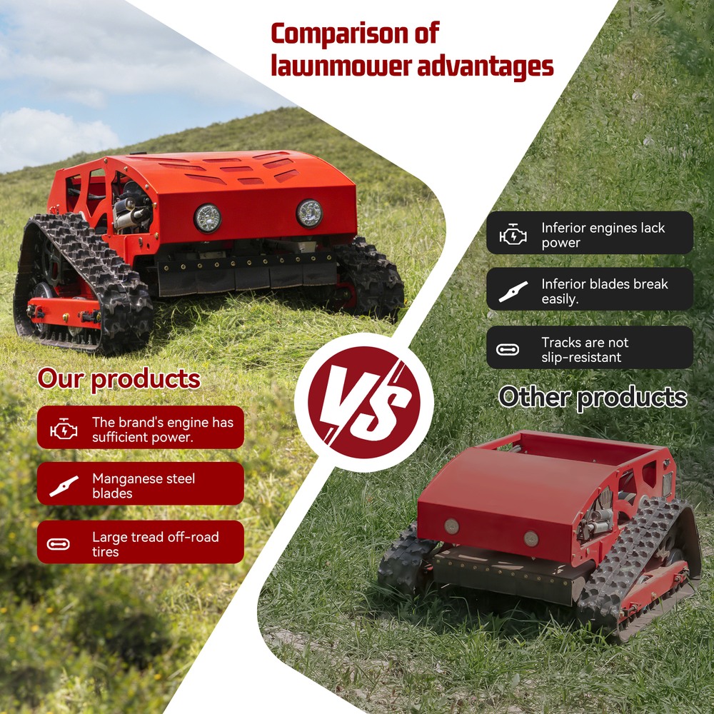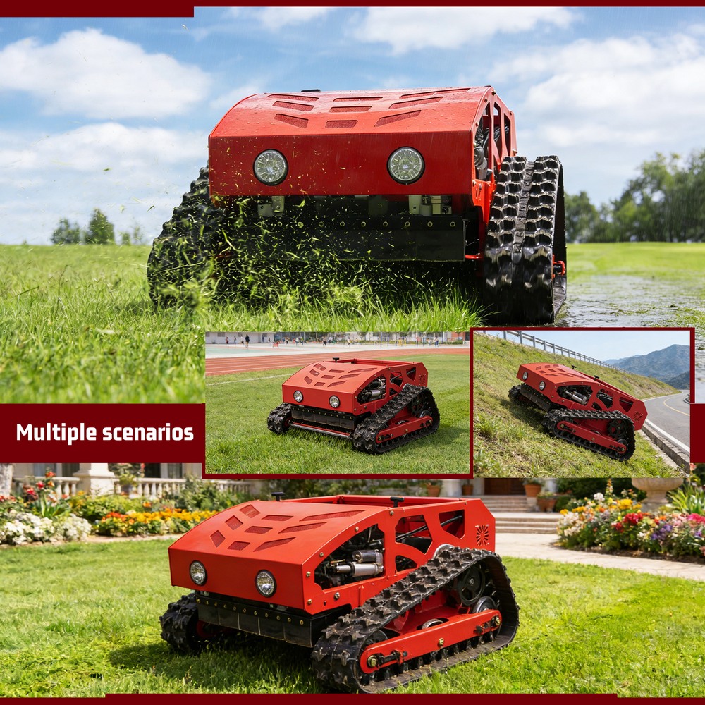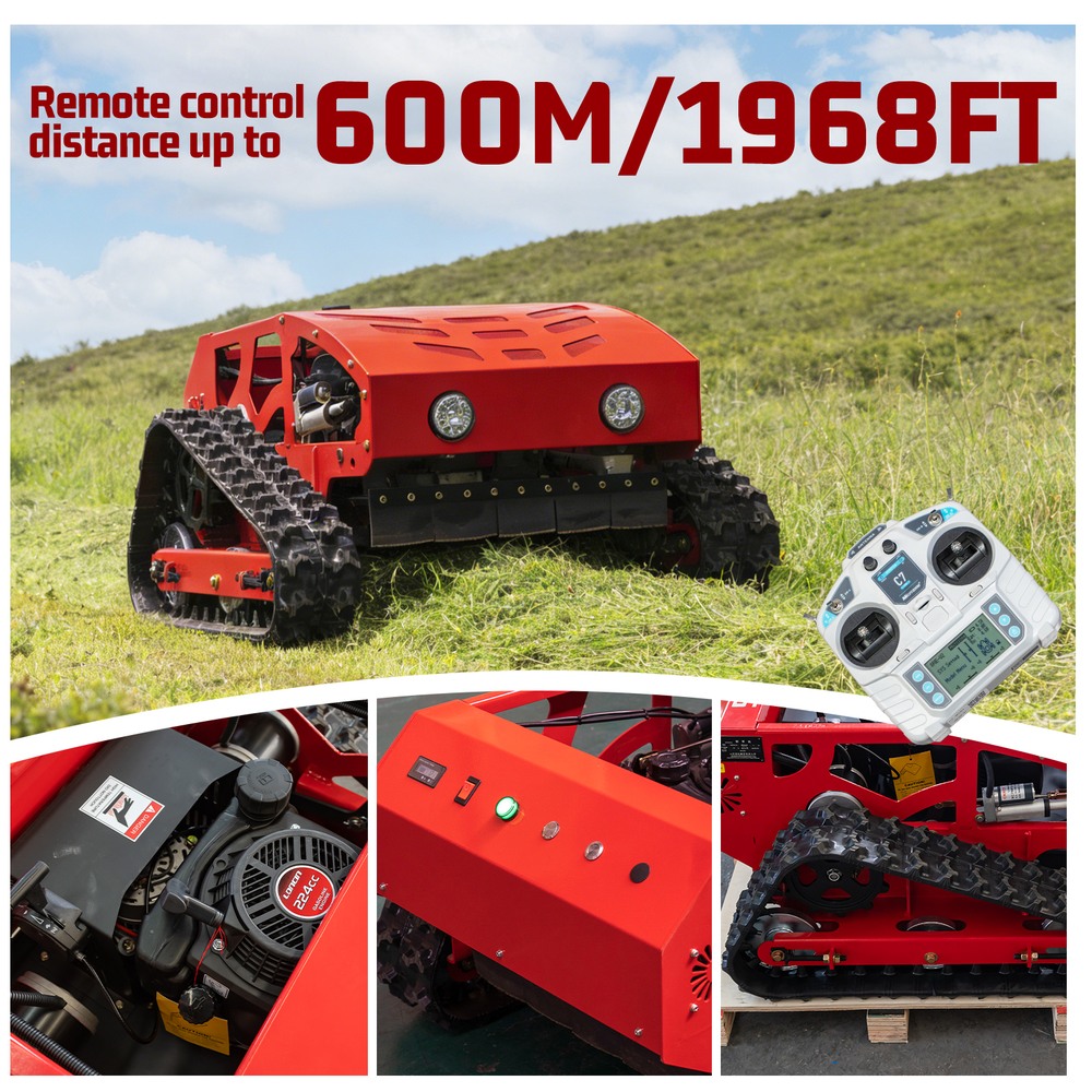 This lawnmower can tracked for complex terrain: Tracked walking + 45° climbing ability easily handles potholes and gentle slopesRemote-controlled header adjustment: 0-6.3in header height adjustable remotely for precise and effortless operation