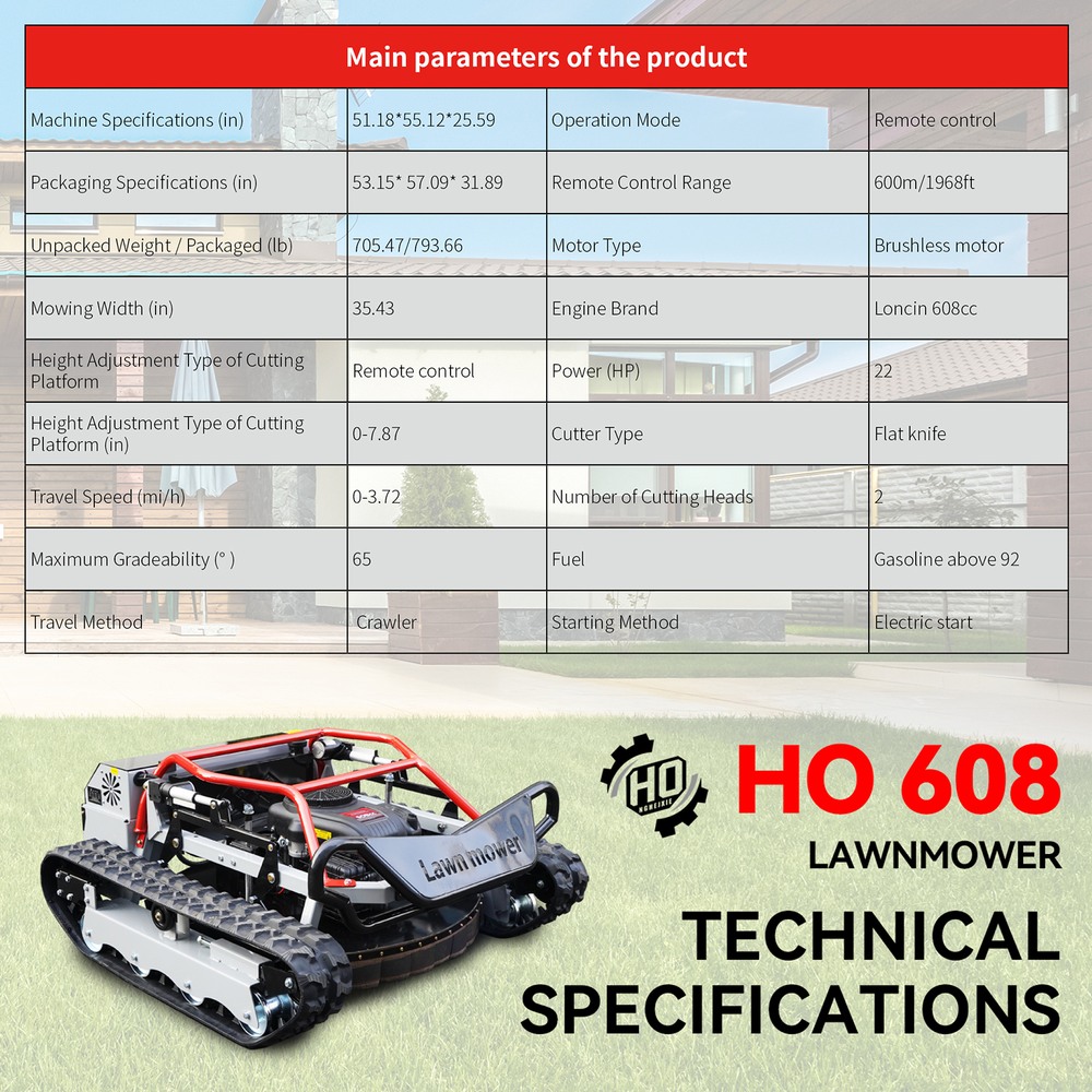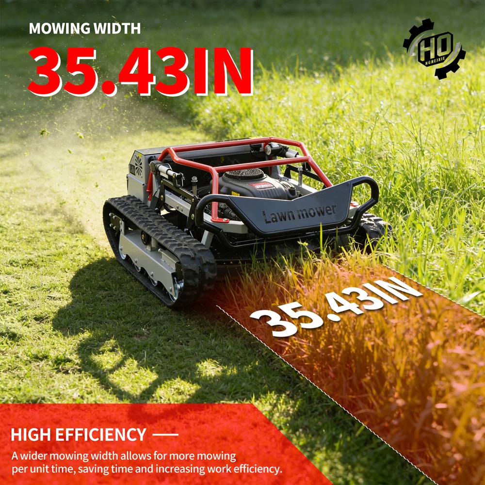 This lawnmower features a 35.43-inch wide cutting width and two flat blades for higher efficiency per job; 0-7.87-inch remote-controlled cutting height adjustment meets diverse mowing needs for lawns, orchards, slopes, and more.