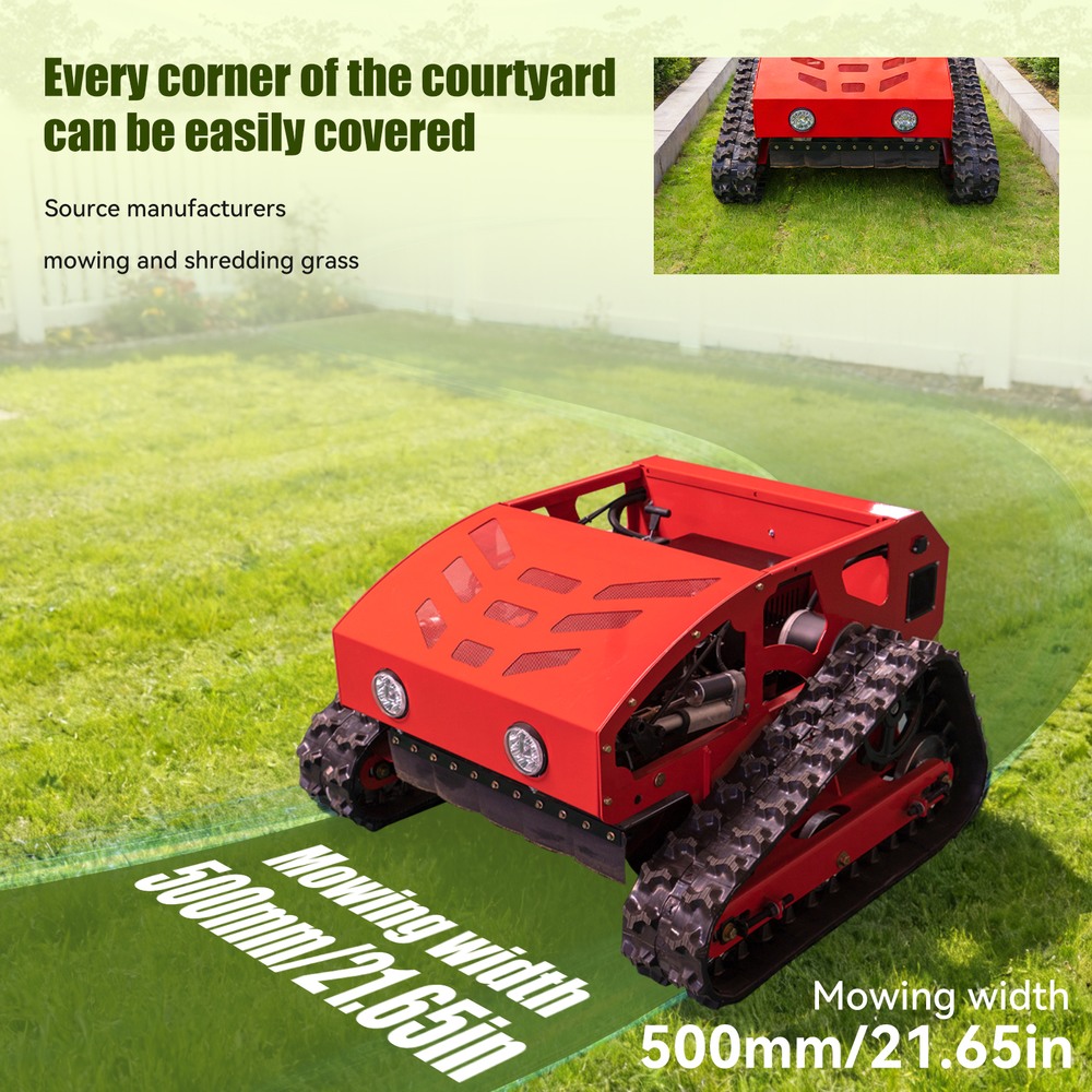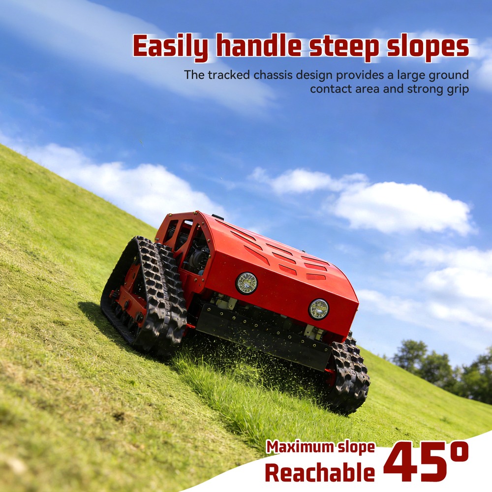 This lawnmower can tracked for complex terrain: Tracked walking + 45° climbing ability easily handles potholes and gentle slopesRemote-controlled header adjustment: 0-6.3in header height adjustable remotely for precise and effortless operation