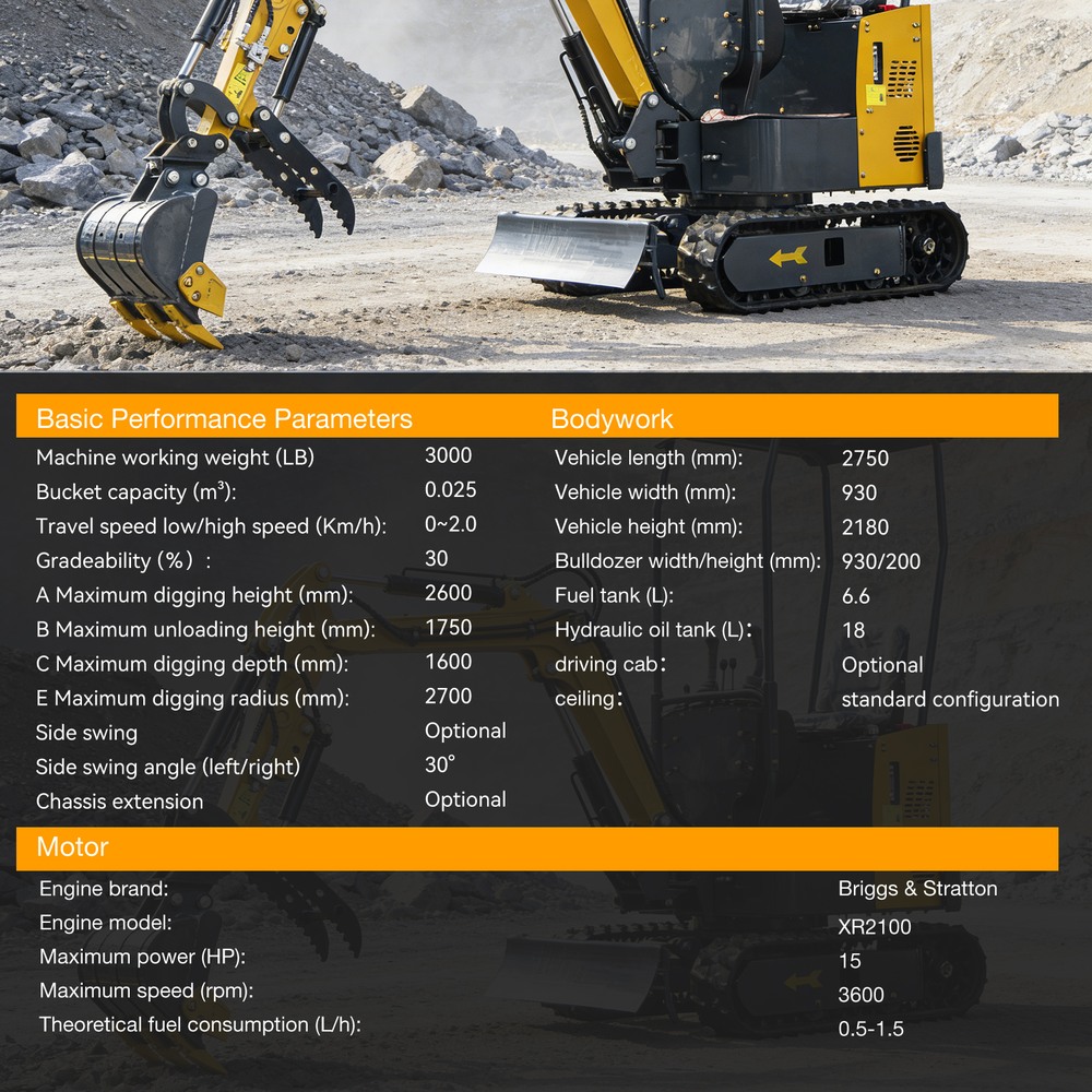 Excavator Crawler Mini Excavator 3300lbs Equipped with 13.5hp Gasoline Reputable Brand Engine and Side-Swing, Standard Hydraulic Thumb Clamp,Quick Change,Ripper, for Various Occasions